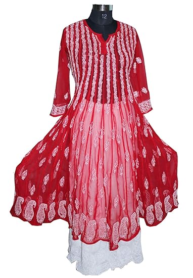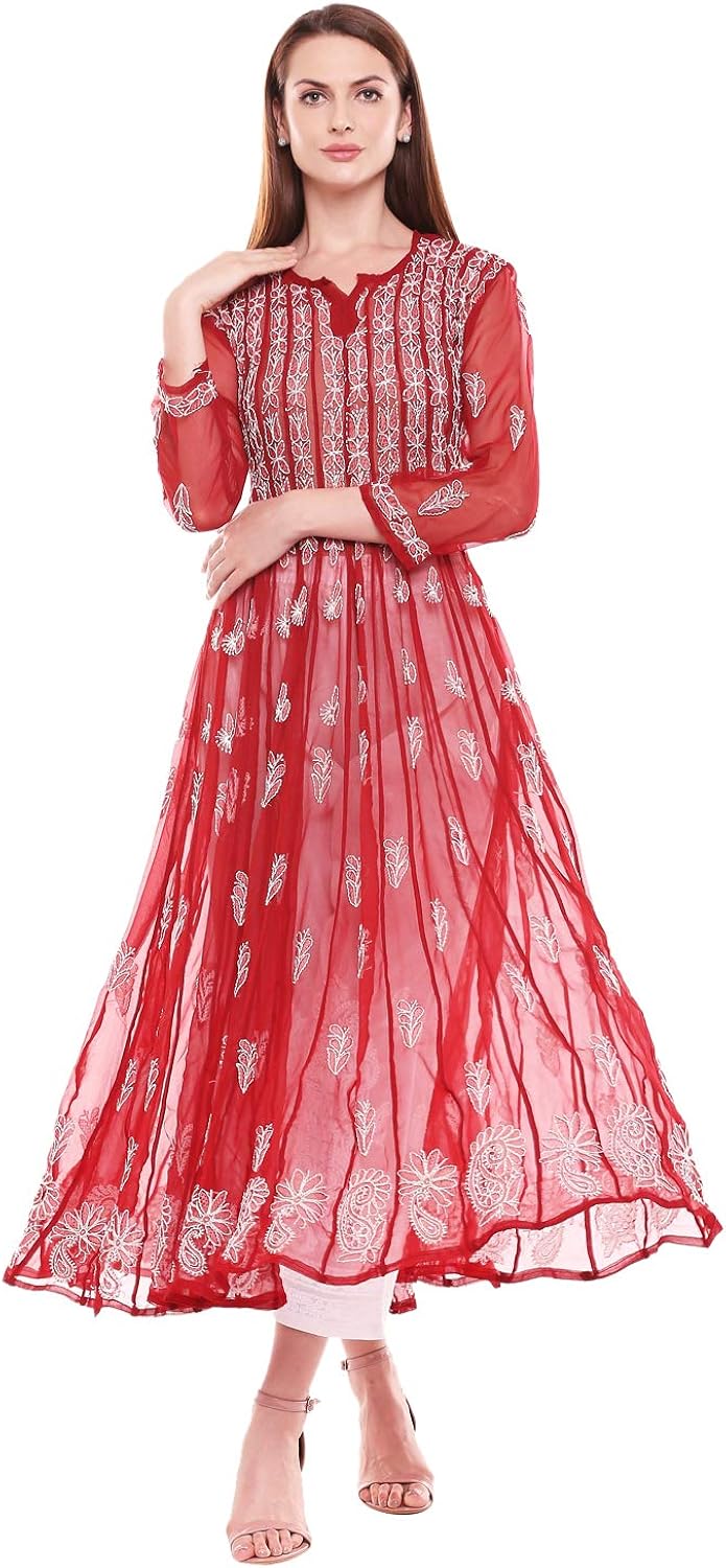 Amazon Com Indiankala4u Lucknow Chikankari Hand Embroidered Long Anarkali 56 Kali Kurti For Women Georgette Clothing - Shop for authentic lucknow chikan :